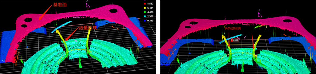 1、通過獲取頂部平面的數據作為參考,計算兩條線上八個點到參考面的段差。 2、通過獲取兩條線的最邊緣點的X軸坐標,計算兩個坐標值的差。 3、提供點云數據,機械手獲取對應信息進行定位焊接。