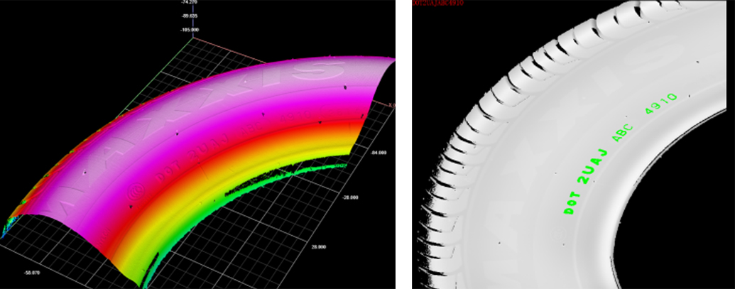 在輪胎字符的檢測中,使用鼎晟三維在線檢測技術,使用戶工廠能夠適應復雜角度、低比度、難識別等在自動檢測中的挑戰(zhàn),